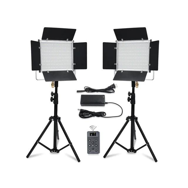 Professional dual LED panel lighting kit with adjustable barn doors, sturdy tripods, power adapters, and remote control—ideal for photography, videography, interviews, reels, and studio shoots.